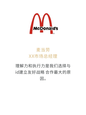 i-d先后經(jīng)歷與Audi、Mercedes-Benz、infiniti、PORSCHE、可口可樂(lè)、麥當(dāng)勞、肯德基、Budweiser、華為、小米、中國(guó)移動(dòng)、ELLE、L'OREAL、萬(wàn)達(dá)、仁恒置地、恒大、碧桂園、蘭桂坊...的業(yè)務(wù)合作,成功地將國(guó)際化的營(yíng)銷(xiāo)策劃理念及執(zhí)行方式融入本土,為更多的中國(guó)企業(yè)開(kāi)啟全新的品牌推廣思路和執(zhí)行方案。